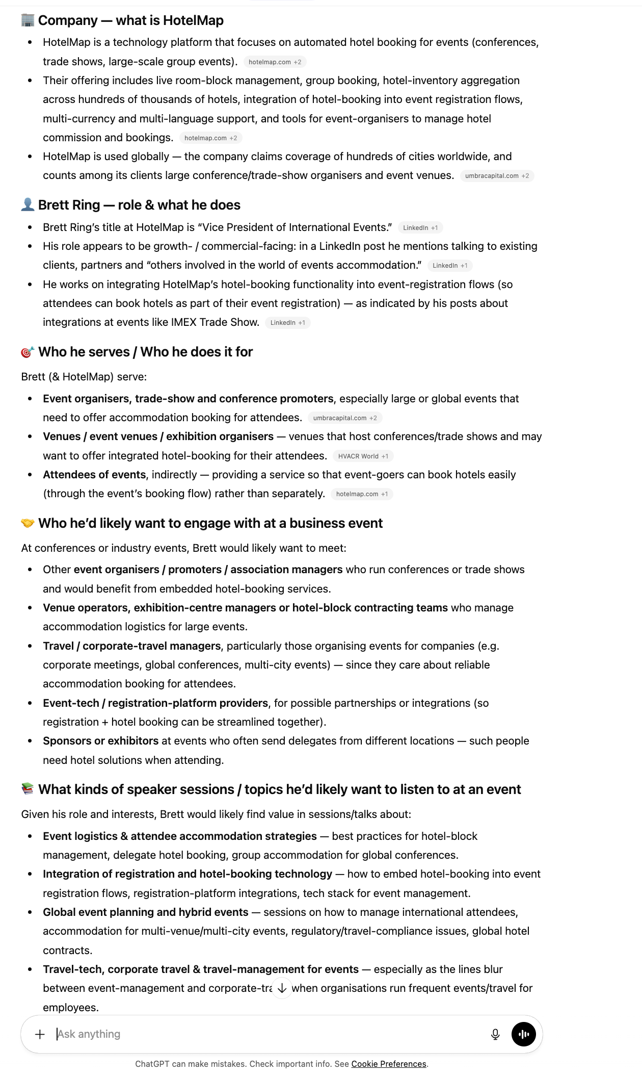 "Find Brett Ring of HotelMap. Study everything you find about him and tell me what he does, who he does it for, what he's interested in, who he would want to engage with at a business event and which speaker sessions types he'd be interested in?"
